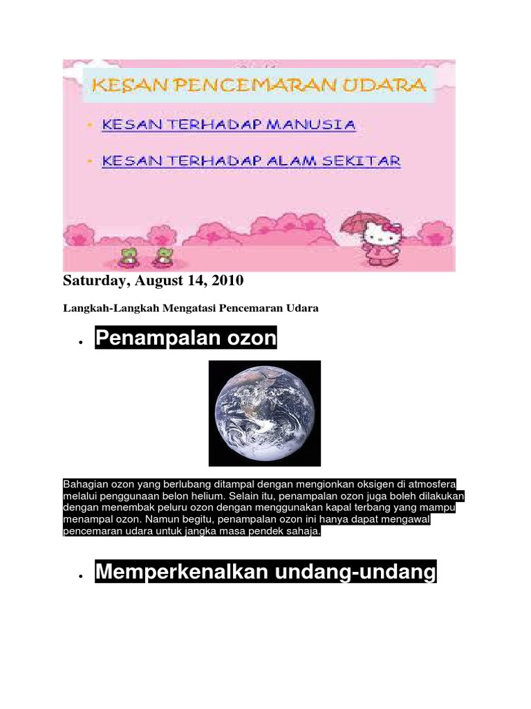 Selain itu, penampalan ozon juga boleh dilakukan dengan menembak peluru ozon dengan menggunakan kapal terbang yang mampu menampal ozon. Hal ini dikarenakan polusi udara banyak yang berasal dari asap kendaraan bermotor. Selainitu, penampalan ozon boleh dilakukan dengan menembakpeluru ozon dengan menggunakan kapal terbang yang mampumenampal ozon. Here are some resumes of keywords to help you find your search, the copyright owner is the original owner, this blog does not. Namun, kemajuan dalam sektor perindustrian telah di kecapi hari ini sedikit tercalar impak daripada sikap manusia yang tidak bertanggungjawab.