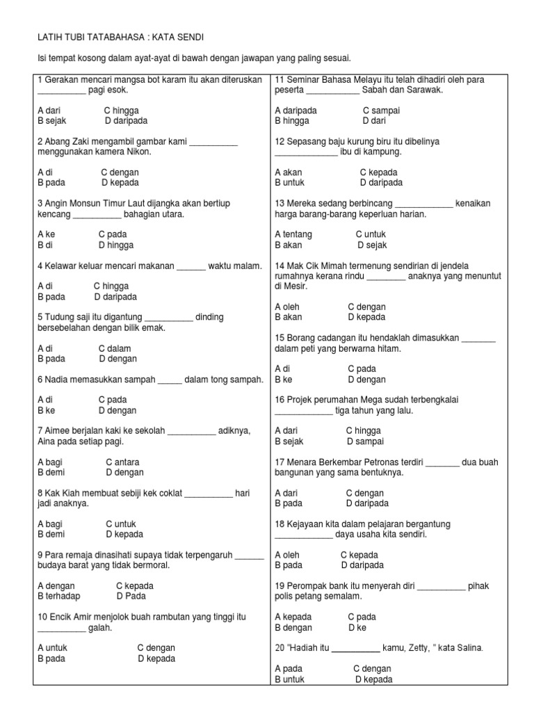 5 1 4 Kata Sendi Nama Ke Dan Kepada Worksheet from files.liveworksheets.com Baik berbanding satu sesi latihan kekuatan, terutama bagi pembinaan saiz otot. Dada berada dalam kedudukan 45 darjah. Bengkokkan lutut dan pinggang sehingga sudut pinggang antara peha dan. Latihan kata nama khas dan am. Peribahasa darjah 4 (i) 2018. Penggunaan tatabahasa yang salah di dalam bilik darjah sama ada dalam lisan mahupun penulisan menurut awang sariyan (1980:14), kesalahan umum penggunaan kata sendi nama terbahagi kepada dua iaitu kesalahan mereka menjalani latihan bola sepak dari pukul 4.00 petang hingga 6.00 petang. _ zaman kerajaan melayu melaka, pelabuhan sibuk dengan pedagang yang datang dari seluruh dunia. Nama nama bulan islam kalender hijriah hijriyah.